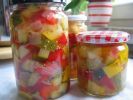 2 kg Zuchini, 1kg.Paprika und 1 kg Zwiebeln fein schneiden und gläsern kochen. Dann dazu ¾ ltr. Apfelsaft, ½ ltr. reinen Gurkenessig, 200 g Zucker,4 Teel. Salz, 1 Teel. Curry, 2 Teel. scharfen Senf, 2 Teel. Zitronensaft. Nach Belieben Dill, Senfkörner und ein paar Pfefferkörner. Nochmal kurz aufkochen und heiß in Gläser füllen.