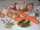 Das Fleisch in Scheiben schneiden und in tiefe Teller legen, dazu Essiggurken-scheiben, geviertelte harte Eier und leicht blanchierte Zwiebelringe, eventuell auch dünne Scheiben Gelbe Rüben (Karotten).