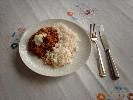 200 g Zwiebeln klein schneiden und mit Butter und Öl in einem Bratentopf glasig andünsten. Dann die Hitze erhöhen und 500 g gemischtes Hackfleisch dazugeben und mit einem Holzlöffel rühren bis das Fleisch leicht braun ist. Die Hitze zurückdrehen und 1 Stange geputzten und in Ringe geschnittenen Lauch, 50 g Tomatenpüree, 1/8 ltr. Gemüsebrühe, 1 Eßl. Senf, 1 Teel. edelsüßer Paprika und einen Teel. Salz dazugeben.