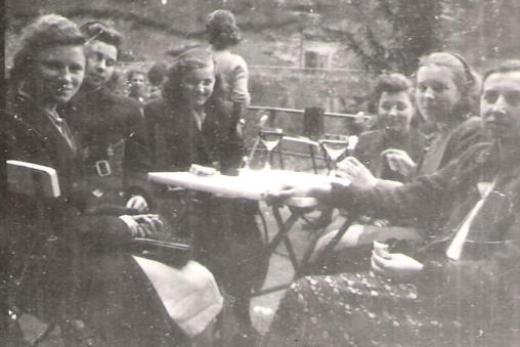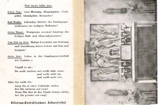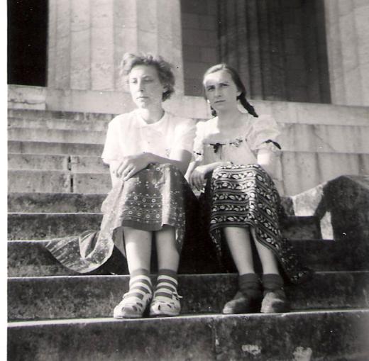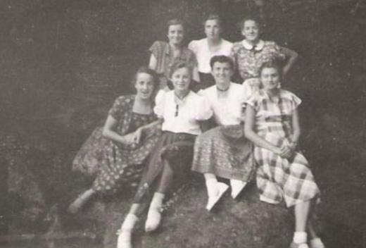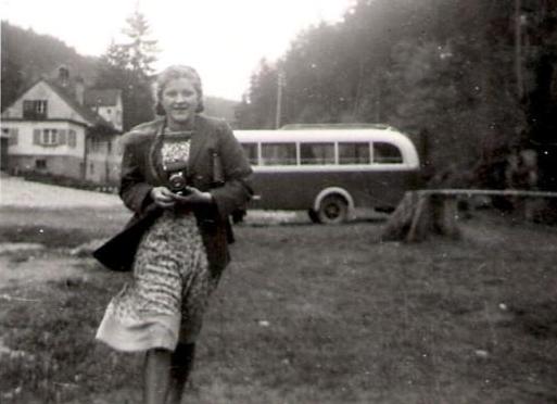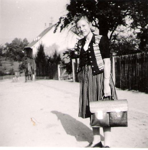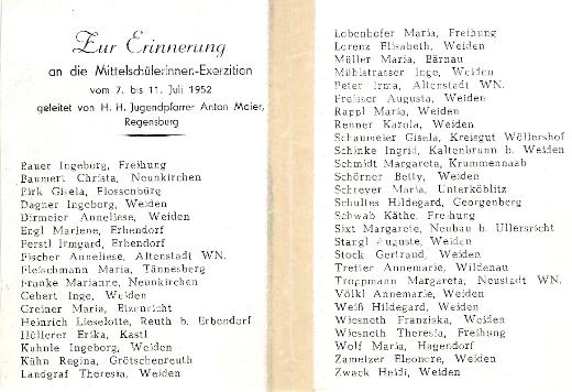 | | Klassenfoto Mittelschule 2. Klasse |  | | Schulausflug in die Fränkische Schweiz. Im Bild Maria Wolf |  | | In der Fränkische Schweiz: Greta, Regina, ?, Maria, Gisa, Marlene |  | | ca. 1950 mein Schulweg. Über den "Kinoberg" hinunten ging es zum Bahnhof. Im Bildhintergrund das ehemelige Kino. |  | | Hier sitze ich mit meiner Schulfreundin Marlene vor der Wallhalla (Schulausflug) mit selbst genähten und selbst bestickten Röcken. |  |  | | Erinnerungsbildchen von unseren Exerzitien im Johannistal 1952 |  | | Exerzitien im Johannistal 1952 |  | | Der Leiter der Exerzitien Jugendpfarrer Anton Meier (hier im Bild vermutlich mit den Herbergseltern) |