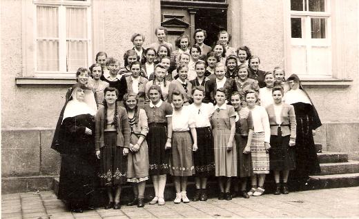 Meine Schulzeit in Erbendorf war nach der 7.Klasse beendet. Ich mußte oder besser gesagt ich durfte mit meiner Freundin Marlene Engl nach Weiden in die Mädchen Mittelschule. Und da ging der Kampf weiter, wir kamen vom Regen in die Traufe. Die Lehrkräfte waren hier ebenfalls Klosterschwestern und waren allesamt bösartig und ungerecht. Marlene und ich lernten bald die Greta, Regina und Lieselotte kennen. Wir hatten den gleichen Schulweg, den wir mußten ja mit dem Zug fahren und damals waren wir oft den ganzen Tag unterwegs. Die Züge waren kalt und finster. Aber so war es halt 1949 - 1952. Geld hatten wir keines und zu Essen auch nicht viel. Aber auch diese Hürde haben wir geschafft. Und jede von uns hatte trotz widrigster Umstände im Juli 1952 die Mittelschule bestanden. In besonderer Erinnerung blieb mir unser Katechet Söltl, der uns immer gut gesinnt war und dem wir alles erzählen konnten und der uns auch in unserem Glauben sehr positiv beeinflusst hat.