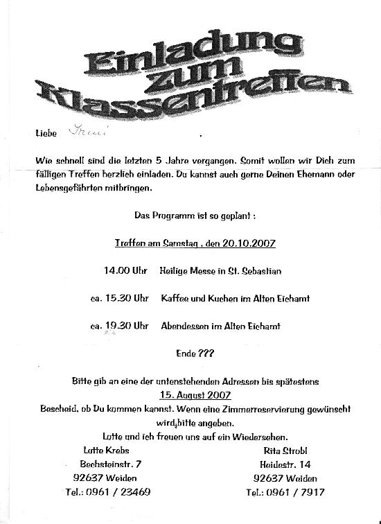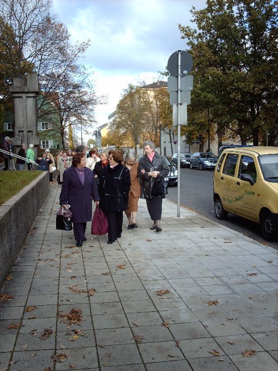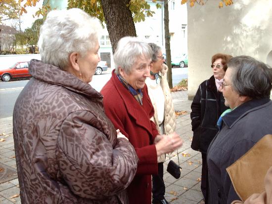 | |  | | Gemeinsames Foto am Amtsgericht |  | | Treffen vor der Sebastianskirche |  | |  | |  | |  | |  | | in der Sebastianskirche |  | |  | | auf dem Weg zum Alten Eichamt |  | |  | |  | |  | |  | |  | | Lisa Baumgartner und Annemarie Völkl |  | | von links: Regina Kühn, Anni Böhm, Anneliese Dirmeier, Irma Peter, Christl Baumert, Anneliese Fischer |  | | von rechts: Irma Peter, Anneliese Dirmeier, Anni Böhm, Regina Kühn, Marlene Engl |  | | Lotte bei der Begrüßung im Alten Eichamt |  | |  | | von links: Grete Sixt, Irmi Ferstl, Marlene Engl |  | | von rechts: Gretl Sixt, Lotte Heinrich, Gusti Preisser | |