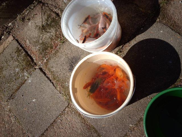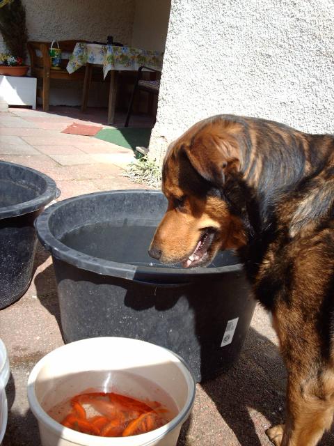 | | In Kübeln warten sie schon auf ihr neues (altes) zuhause |  | | Justus überwacht die ganze Aktion |  | | Roland (rechts) |  | | Unser Großvater(mutter)-Goldfisch ist schon 27 Jahre alt |  | | Schnell haben sie ihr Revier wiederentdeckt |  | | Und Justus fühlt sich in der stinkenden Wanne sichtlich wohl - pfui ! |