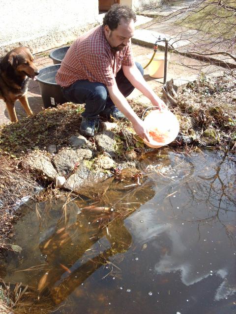 Am 8. April haben wir unsere Goldfisch-Familie wieder in ihren angestammten Gartenteich eingesetzt. Sie haben die Überwinterung im Felsenkeller gut überstanden.